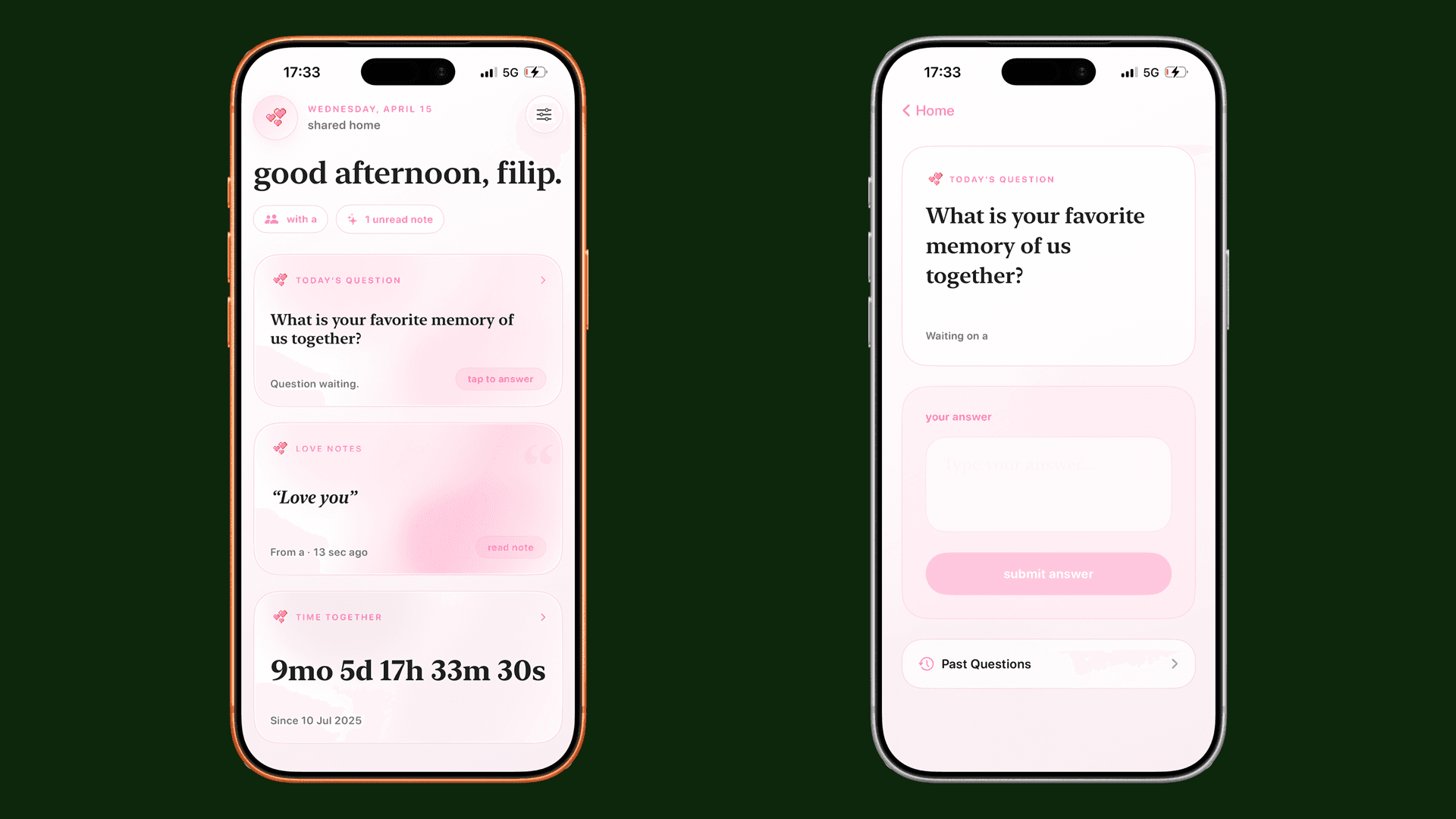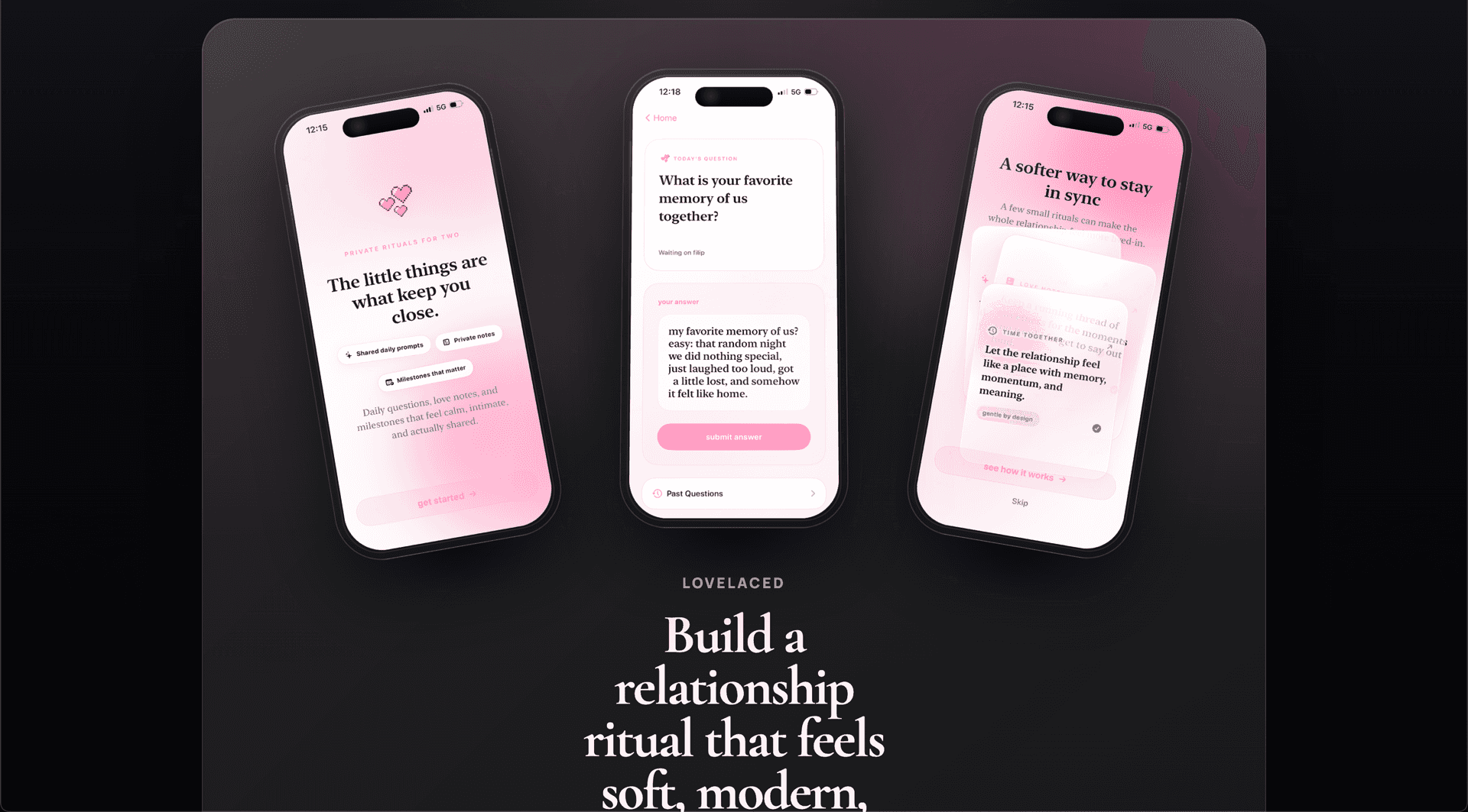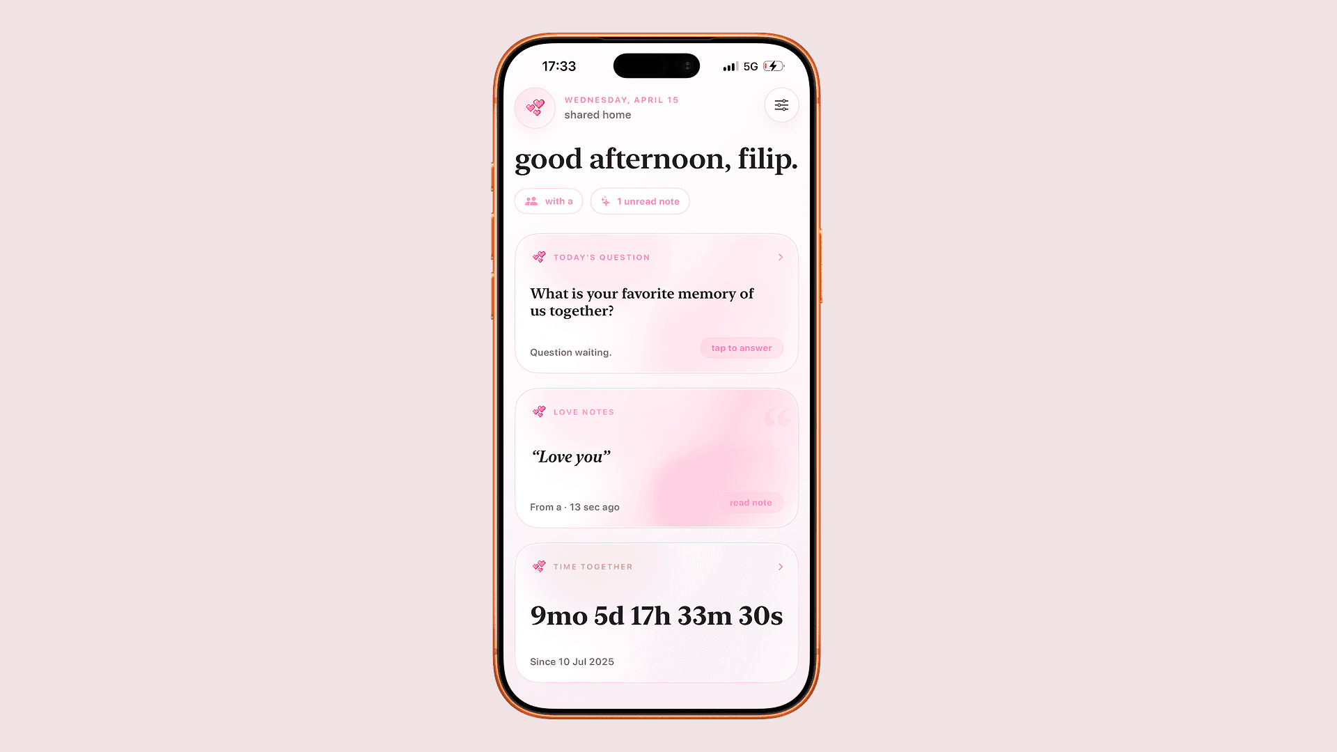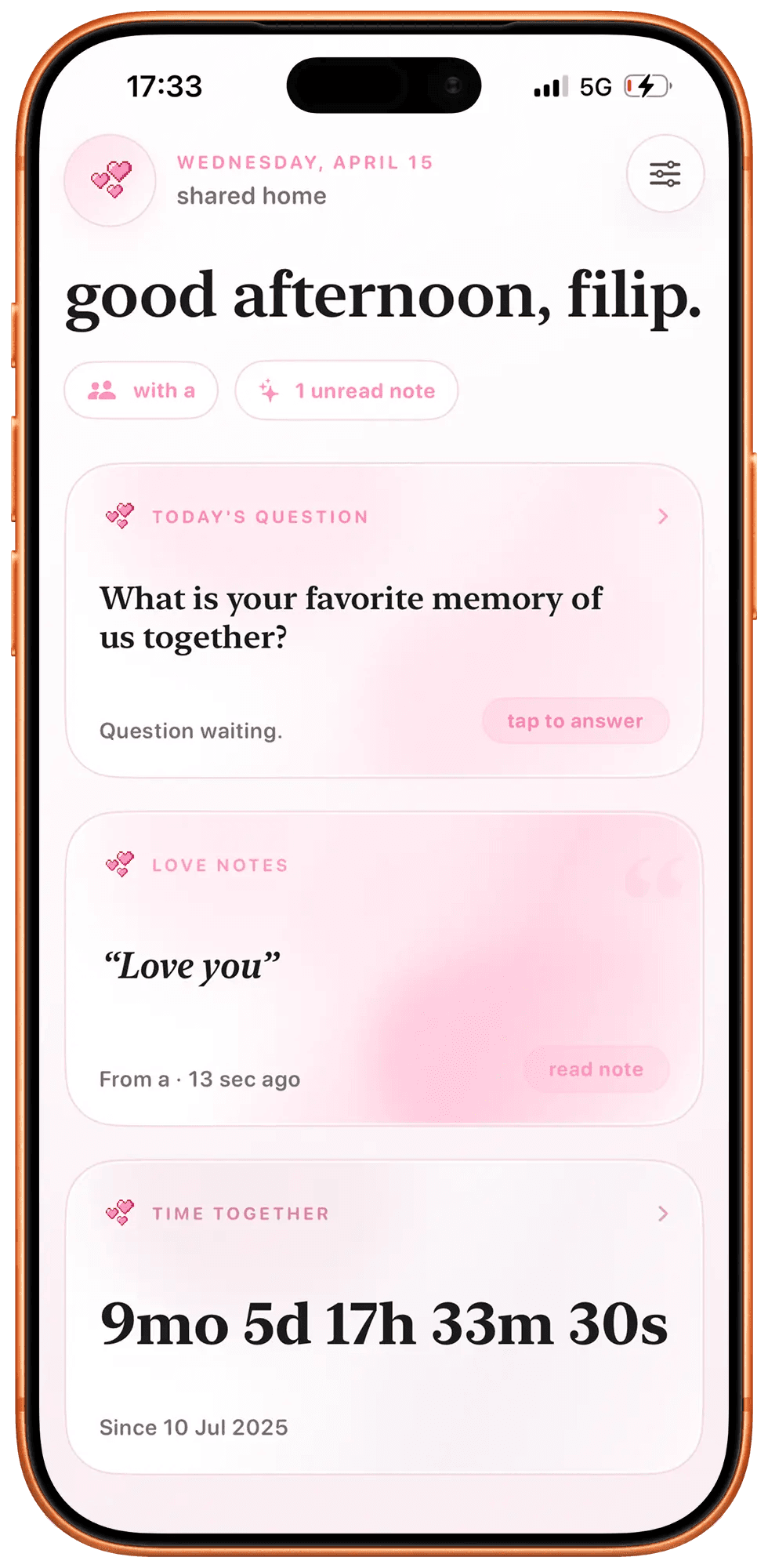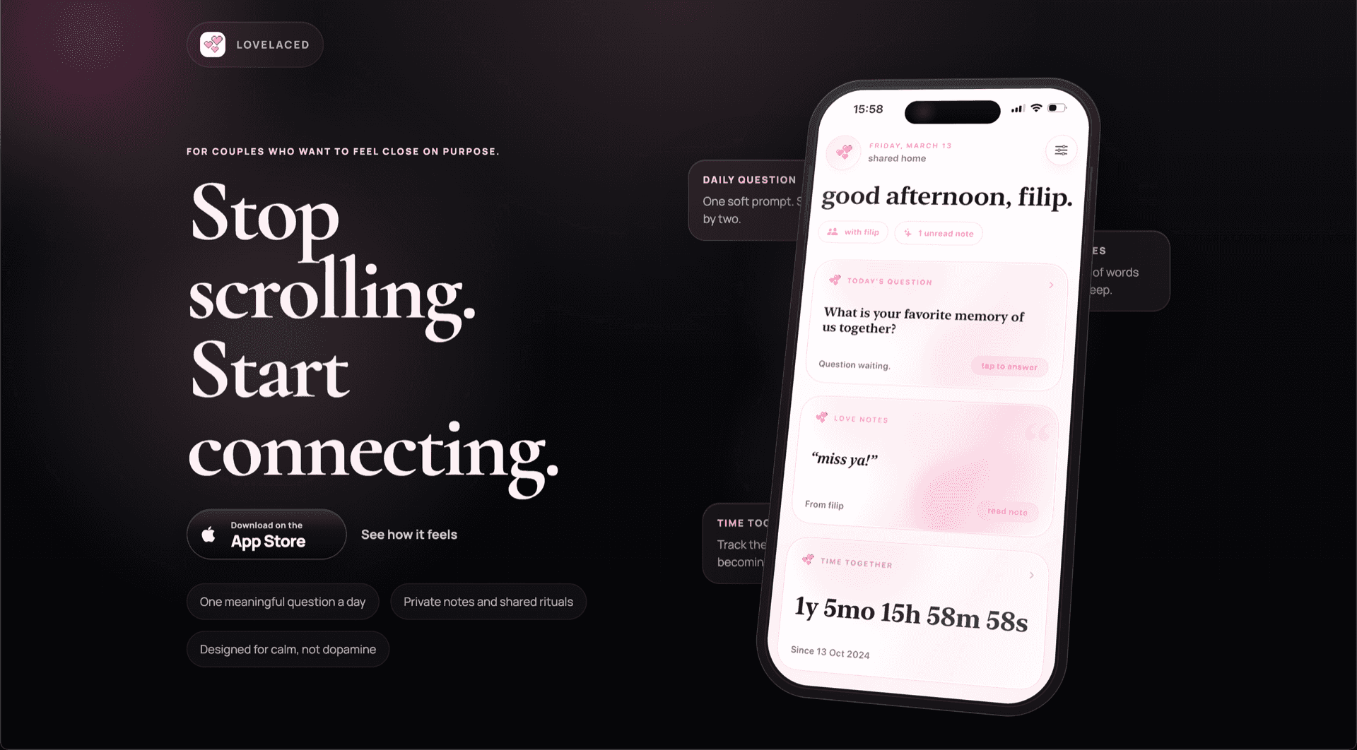 Landing page pre iOS appku pre páry — widget-first positioning, soft-minimal estetika.